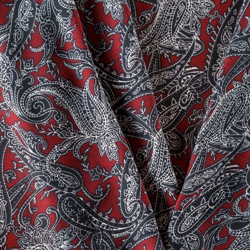 Шифон бордового оттенка с черно-белым принтом пейсли. Струящийся, летящий, воздушный, полупрозрачный. На ощупь мягкий и приятный. Подойдет для пошива тончайших воздушных блуз, изумительных платьев со сборками и воланами и элегантных шарфов.