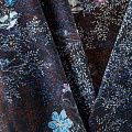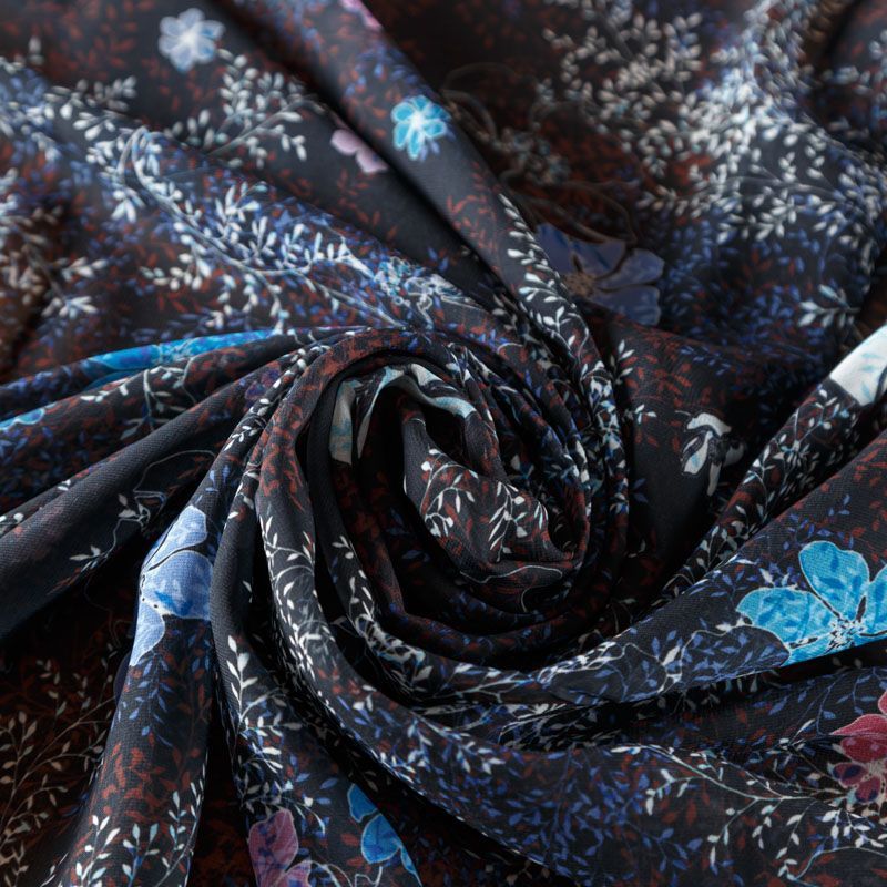 Шифон черного оттенка с растительным принтом. Струящийся, летящий, воздушный, полупрозрачный. На ощупь мягкий и приятный.Подойдет для пошива тончайших воздушных блуз, изумительных платьев со сборками и воланами и элегантных шарфов.