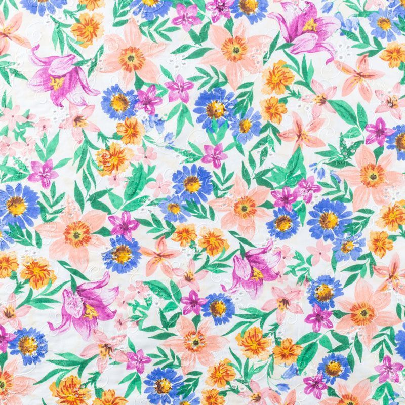 Тренд и мастхэв этого лета - итальянское шитье-ришелье на хлопковой основе с ярким цветочным принтом. Изящный тонкий узор выполнен путём машинной вышивки нитками в цвет ткани и расположен по всему полотну. Ткань мягкая, приятная на ощупь, слегка просвечивает. Идеально подойдет для пошива рубашки, блузы, топа в воланами, туники, платья, сарафана, юбки.