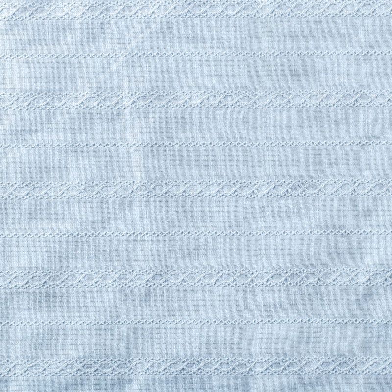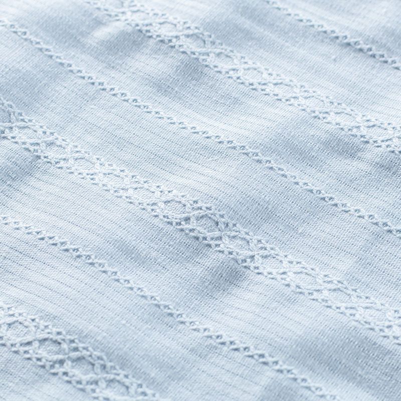 Мягкий и нежный итальянский хлопок выбеленного голубого оттенка с изящной вышивкой. Узор выполнен путём машинной вышивки нитками в цвет ткани и расположен вдоль кромки. Фактура ткани неоднородная, имеет тенденцию к сминаемости, не много просвечивает, не тянется, приятная на ощупь. Идеально подходит для создания летних платьев, сарафанов, юбок, блузок и топов.