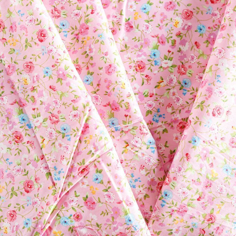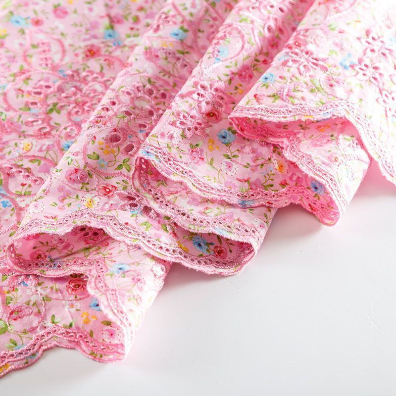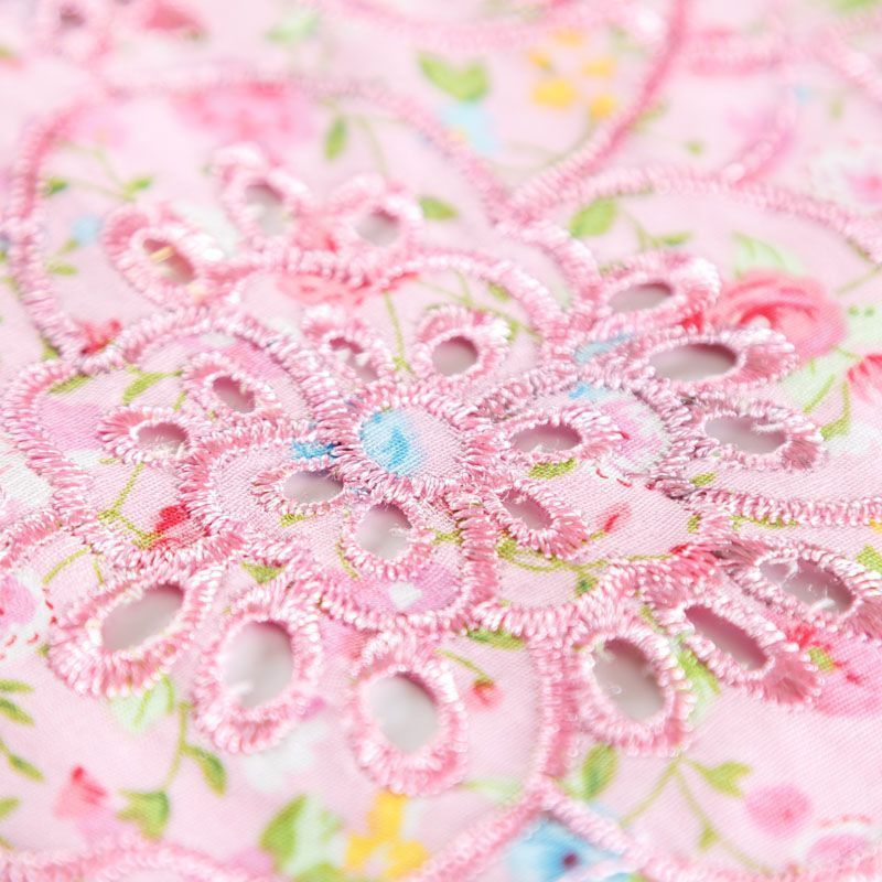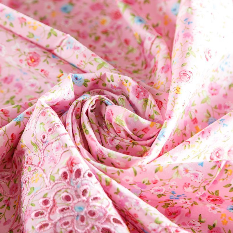 Мягкий и нежный хлопок розового оттенка с мелким романтичным цветочным принтом украшен изящной вышивкой и перфорацией.  Узор выполнен путём машинной вышивки нитками в цвет ткани и расположен вдоль одной кромки, поэтому набирается на изделие объемом. Ткань тонкая, легкая, не сухая, имеет тенденцию к сминаемости, не много просвечивает, не тянется, приятная на ощупь. Идеально подходит для создания летних платьев, сарафанов, юбок, блузок, топов, шорт.