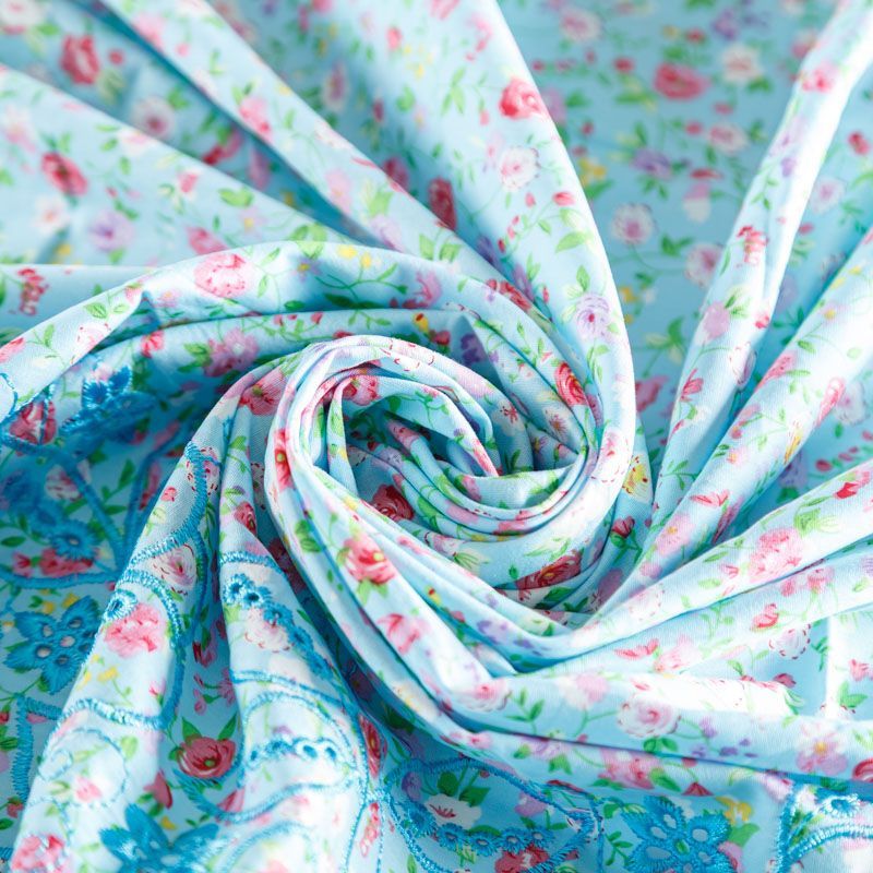 Мягкий и нежный хлопок голубого оттенка с мелким романтичным цветочным принтом украшен изящной вышивкой и перфорацией. Узор выполнен путём машинной вышивки нитками в цвет ткани и расположен вдоль одной кромки, поэтому набирается на изделие объемом. Ткань тонкая, легкая, не сухая, имеет тенденцию к сминаемости, не много просвечивает, не тянется, приятная на ощупь. Идеально подходит для создания летних платьев, сарафанов, юбок, блузок, топов, шорт.