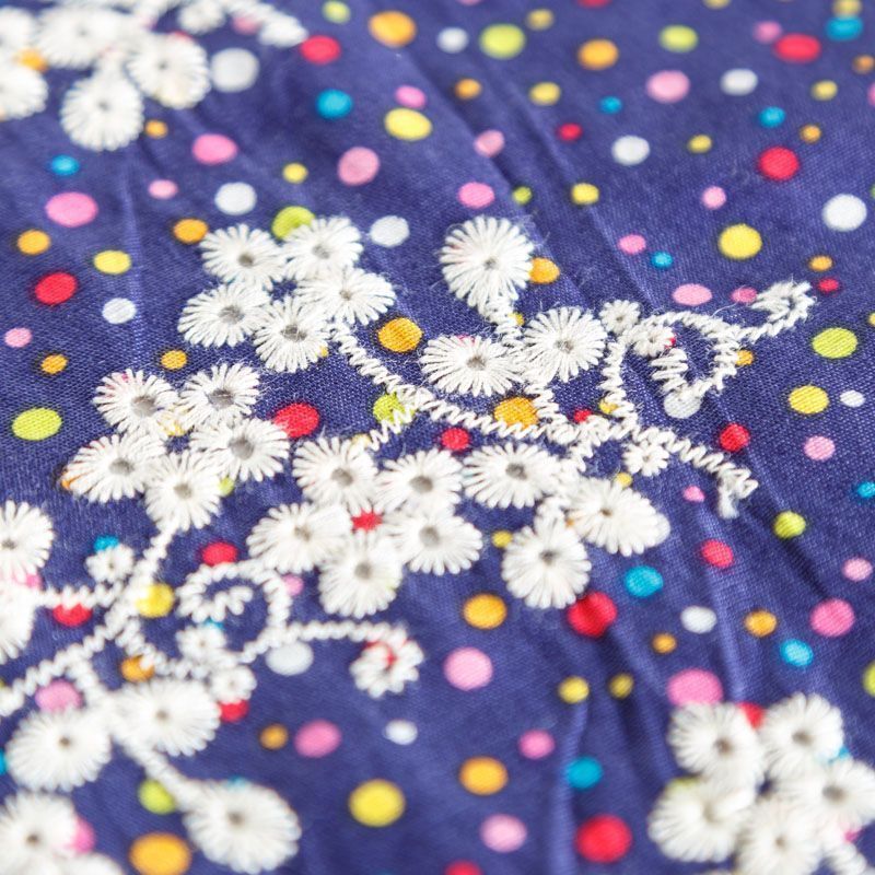 Мягкий и нежный хлопок синего цвета с мелким цветным принтом принтом украшен контрастной вышивкой. Узор выполнен путём машинной вышивки и расположен вдоль одной кромки, образуя фестон, поэтому набирается на изделие объемом. Ткань легкая, не сухая, хорошо драпируется и держит форму, имеет тенденцию к сминаемости, не просвечивает, не тянется, приятная на ощупь. Идеально подходит для создания летних платьев, сарафанов, юбок, блузок, топов, шорт.