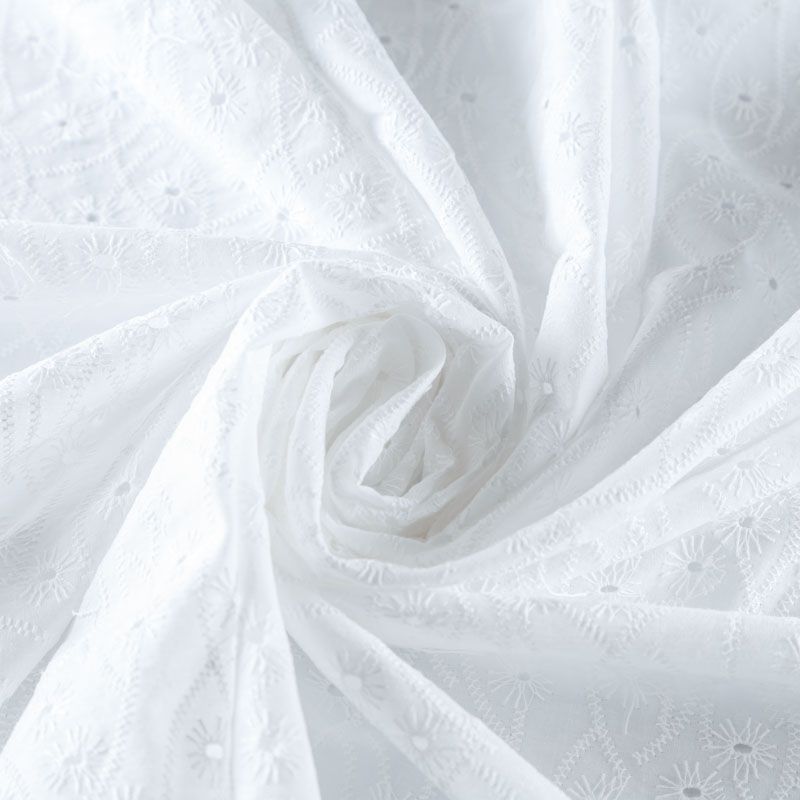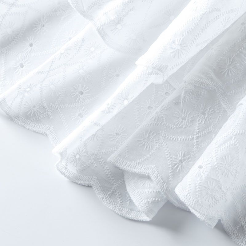 Итальянское шитье на белоснежной хлопковой основе с абстрактной, элегантной вышивкой, расположеннной по всему полотну. Ткань мягкая, легкая, пластичная, приятная на ощупь, просвечивает, потребуется подклад. Обе кромки ткани оформлены фигурными фестонами. Идеально подойдет для пошива рубашки, блузы, топа в воланами, туники, платья, сарафана, юбки, шорт.