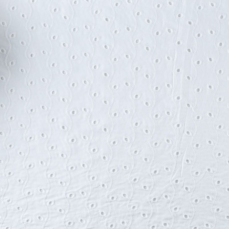 Итальянское шитье на белоснежной хлопковой основе с растительной элегантной вышивкой,  расположеннной по всему полотну. Ткань мягкая, легкая, пластичная, приятная на ощупь, просвечивает, потребуется подклад. Обе кромки ткани оформлены фигурными фестонами. Идеально подойдет для пошива рубашки, блузы, топа в воланами, туники, платья, сарафана, юбки, шорт.