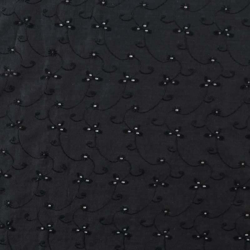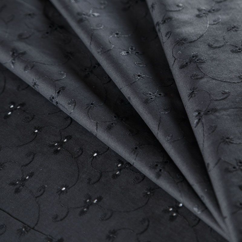 Мягкий и нежный хлопок черного оттенка с вышивкой и перфорацией. Узор выполнен путём машинной вышивки нитками в цвет ткани и расположен по всему полотну. Фактура ткани однородная, имеет тенденцию к сминаемости, не тянется, приятная на ощупь. Может потребоваться подклад. Идеально подходит для создания летних платьев, сарафанов, юбок, блузок и топов.