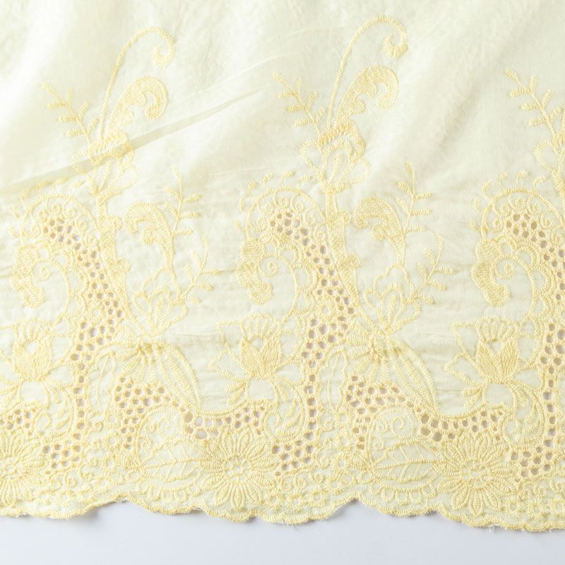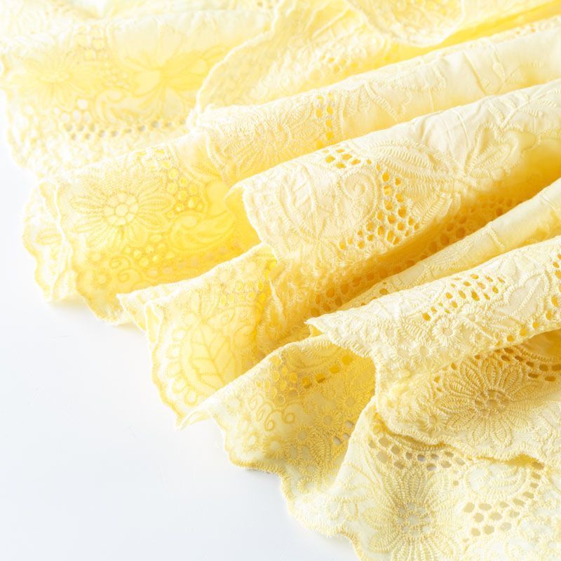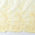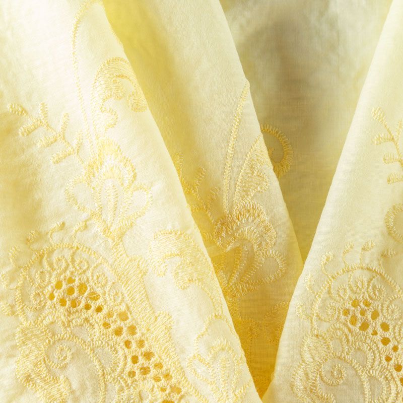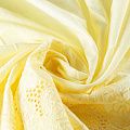 Мягкий и нежный хлопок желтого оттенка с изящной вышивкой. Узор выполнен путём машинной вышивки нитками в цвет ткани и расположен вдоль кромки. Обе кромки ткани оформлены фигурными фестонами. Фактура ткани однородная, имеет тенденцию к сминаемости, просвечивает, не тянется, приятная на ощупь. Набирается на изделие объемом. Идеально подойдет для пошива летнего сарафана, рубашки, блузы, топа в воланами, туники, платья, юбки, шорт.