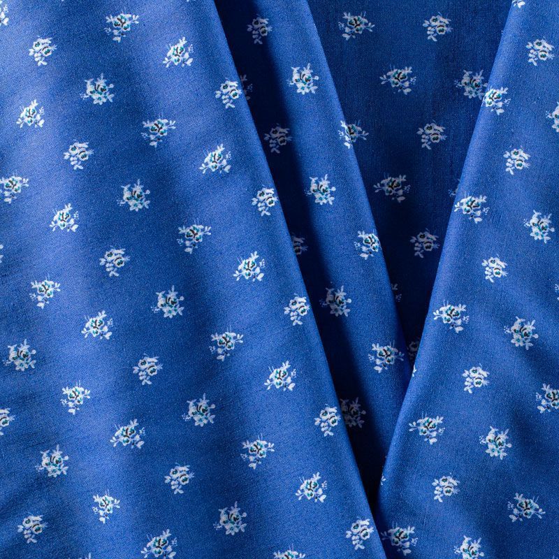 Плательно-блузочный штапель с мелким цветочным принтом на синем джинсовом фоне. Мягкий, тонкий, нежный, пластичный, приятный на ощупь, хорошо драпируется, практичный. Подойдет для пошива платья, топа, блузки, рубашки, юбки, летних брюк.