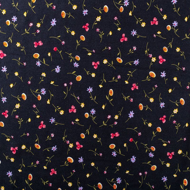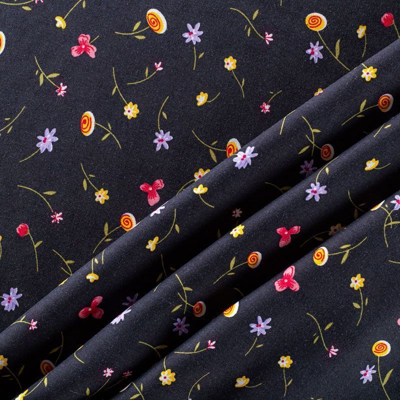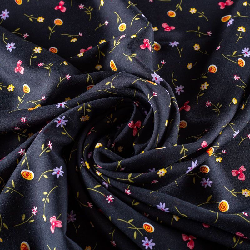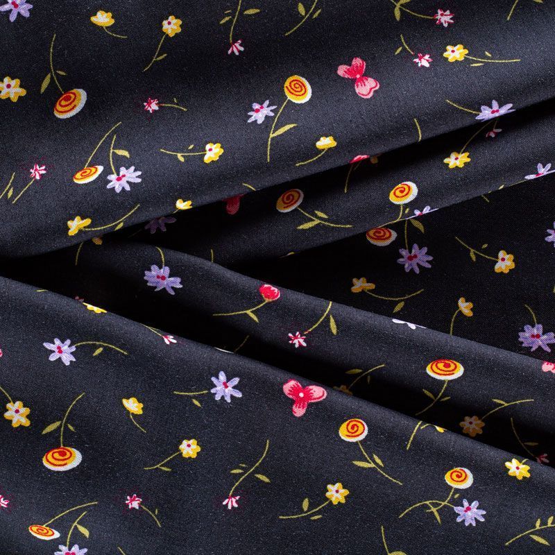 Итальянский плательно-блузочный штапель с мелким цветочным принтом на черном фоне. Мягкий, тонкий, нежный, пластичный, приятный на ощупь, хорошо драпируется, практичный. Подойдет для пошива платья, топа, блузки, рубашки, юбки, летних брюк.