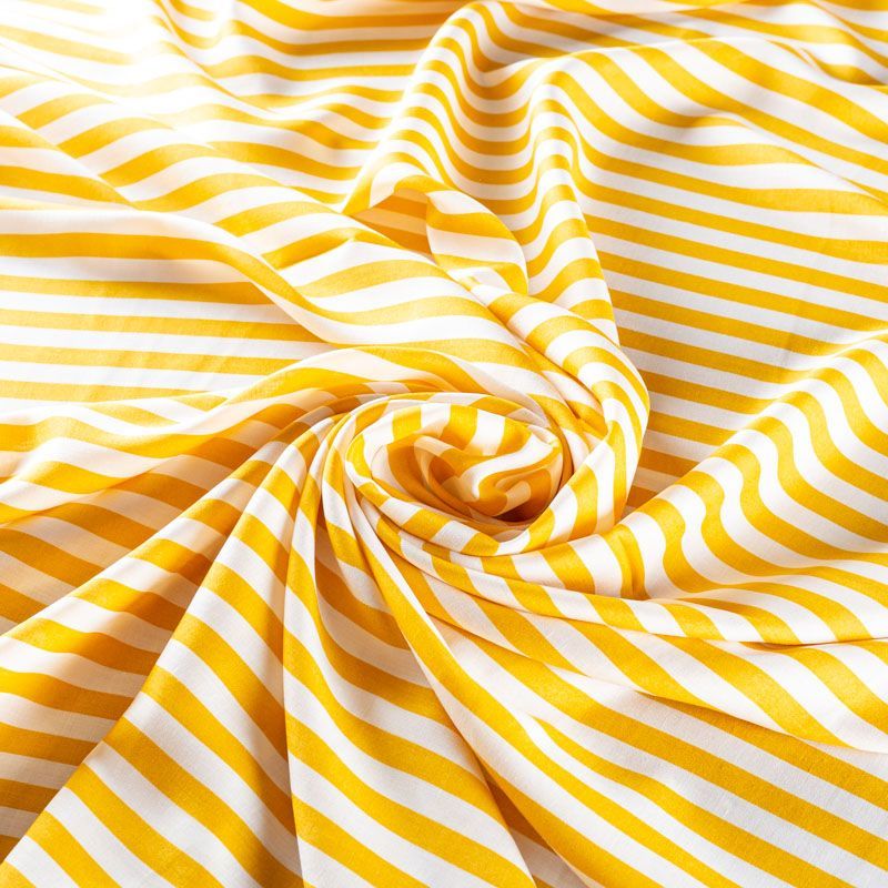 Плательно-блузочный штапель в вертикальную полоску средней ширины яркого желтого цвета. Ткань мягкая, тонкая, нежная, пластичная, приятная на ощупь, хорошо драпируется, практичная, поверхность слегка фактурная. Подойдет для пошива платья, топа, блузки, рубашки, юбки, летних брюк.