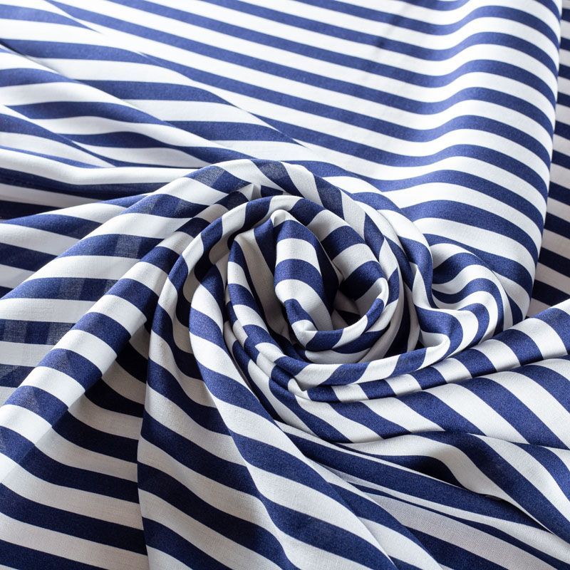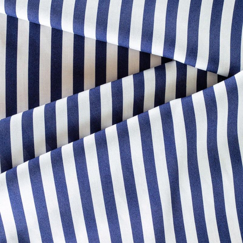 Плательно-блузочный штапель в вертикальную полоску средней ширины темно-синего оттенка. Ткань мягкая, тонкая, нежная, пластичная, приятная на ощупь, хорошо драпируется, практичная, поверхность слегка фактурная. Подойдет для пошива платья, топа, блузки, рубашки, юбки, летних брюк.