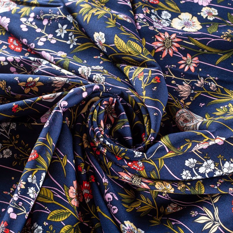 Плательно-блузочный штапель с элегантным цветочным принтом на темно-синем фоне. Мягкий, тонкий, нежный, пластичный, приятный на ощупь, хорошо драпируется, практичный. Подойдет для пошива платья, топа, блузки, рубашки, юбки, летних брюк.