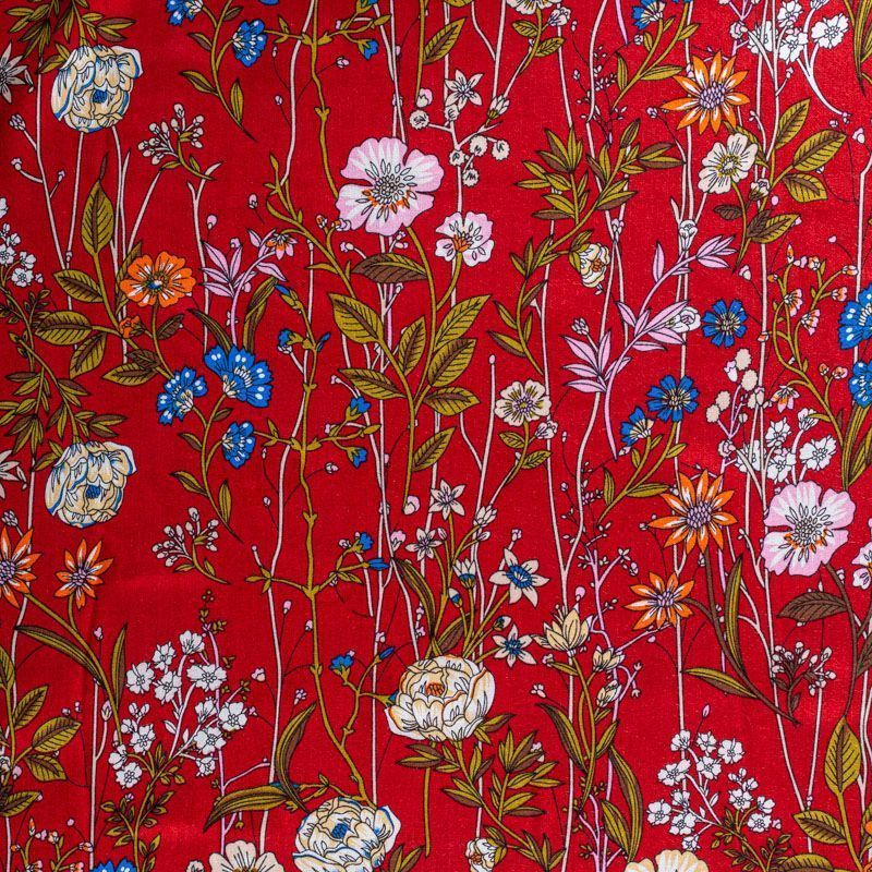 Плательно-блузочный штапель с элегантным цветочным принтом на красном фоне. Мягкий, тонкий, нежный, пластичный, приятный на ощупь, хорошо драпируется, практичный. Подойдет для пошива платья, топа, блузки, рубашки, юбки, летних брюк.