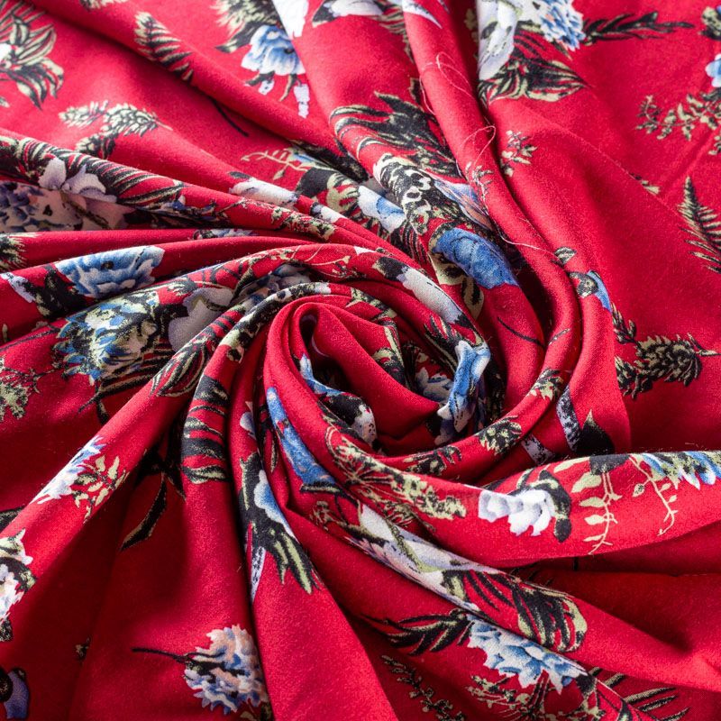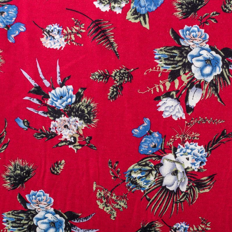 Плательно-блузочный штапель с цветочным принтом на сочном вишневом фоне. Мягкий, тонкий, нежный, пластичный, приятный на ощупь, хорошо драпируется, практичный. Подойдет для пошива платья, топа, блузки, рубашки, юбки, летних брюк.