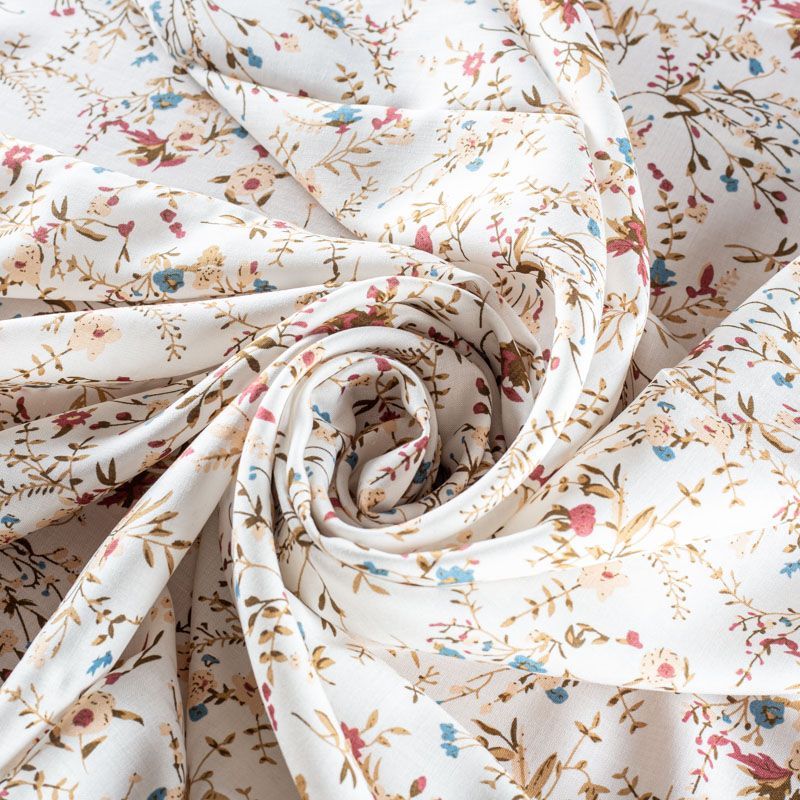 Плательно-блузочный штапель с цветочным принтом на белом фоне. Мягкий, тонкий, нежный, пластичный, приятный на ощупь, хорошо драпируется, практичный. Подойдет для пошива платья, топа, блузки, рубашки, юбки, летних брюк.