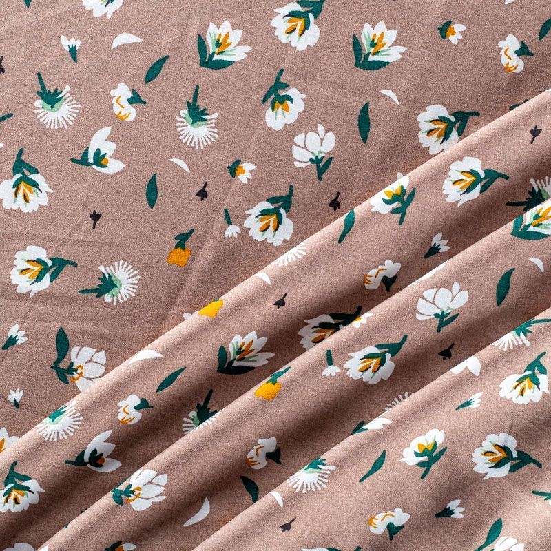 Плательно-блузочный штапель с цветочным принтом на пепельно-коричневом фоне. Мягкий, тонкий, нежный, пластичный, приятный на ощупь, хорошо драпируется, практичный. Подойдет для пошива платья, топа, блузки, рубашки, юбки, летних брюк.