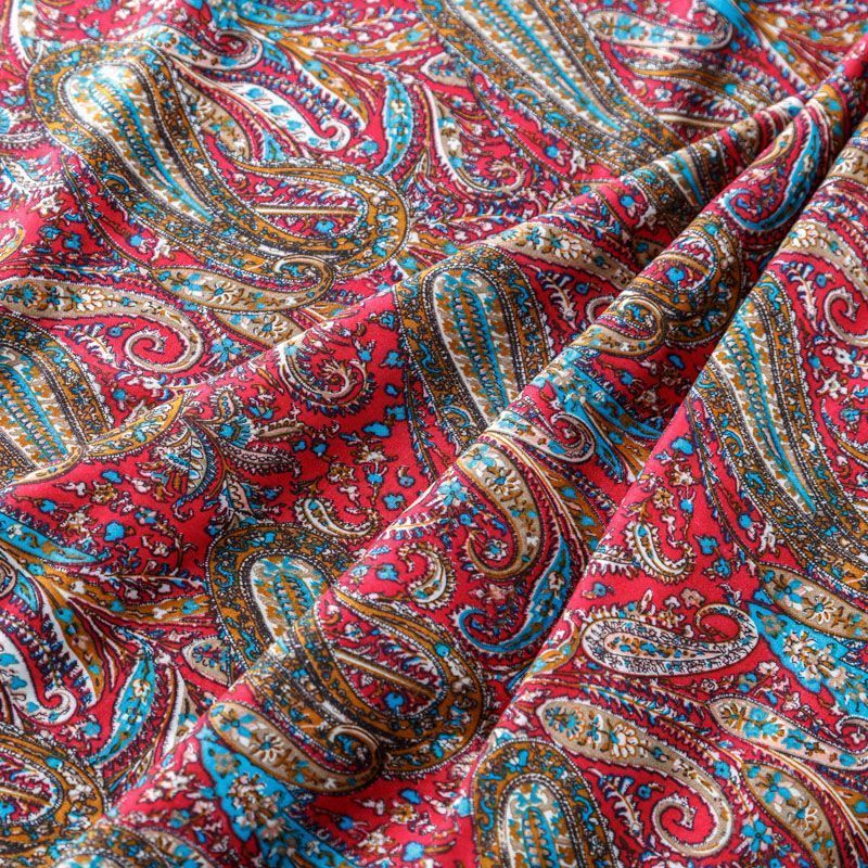 Плательно-блузочный штапель с ярким узором пейсли на малиново-красном фоне. Ткань мягкая, тонкая, нежная, пластичная, приятная на ощупь, хорошо драпируется, практичная. Подойдет для пошива платья, топа, блузки, рубашки, юбки, летних брюк.