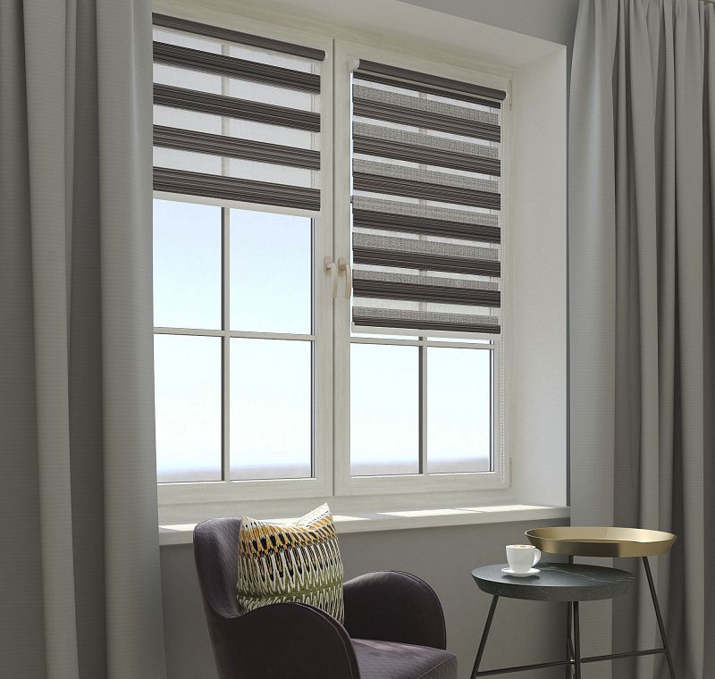 Рулонная штора День-Ночь в отличии от обычных рулонных штор состоит из двойной ткани, которая создает чередование прозрачного и плотного материала. За счет смещения этих слоев относительно друг друга,  можно регулировать количество света. Полотнище само по себе декоративно и необычно - вы сможете выбрать себе шторы для любого интерьера из разнообразных расцветок и дизайнов. Одной шторой день-ночь вы замените и традиционную тюль, и портьеры. Преимущества: экономят пространство; имеют пылеотталкивающую пропитку - вам не придется их стирать, развешивать. В крайнем случае можно протереть влажной губкой. При проветривании хорошо пропускают воздух. Механизм управления цепочечный. Установка шторы возможна на раму, на стену и в проем.