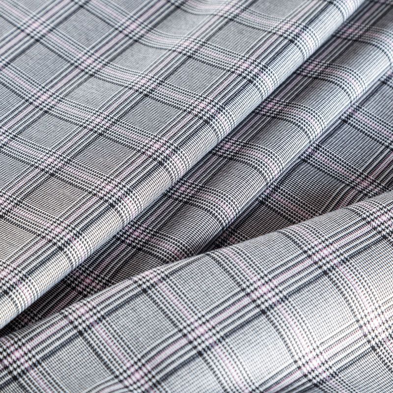 Ткань средней плотности, легкая и мягкая, приятная на ощупь, немного эластичная, хорошо драпируется и образует мягкие складки. Сочетание линий серого, белого и розового оттенков и принта "гусиная лапа" образует сложную красивую клетку. Монохромный строгий принт разбавляет еле уловимая элегантная тонкая полоска розового цвета. Ткань отлично подойдет на костюмы, юбки, брюки, платья, жакеты.