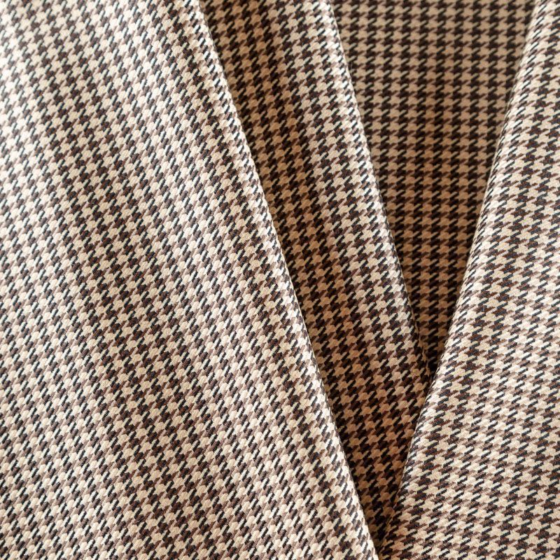 Итальянская костюмно-плательная шерсть средней плотности в актуальном бежевом цвете с классическим узором гусиная лапка в коричневых оттенках. Поверхность ткани имеет выраженное диагональное плетение, на ощупь гладкая, полированная благодаря содержанию шерсти ламы. Ткань очень мягкая, теплая, уютная, шерсть не колется, в носке очень комфортная. Подойдет для пошива стильного костюма, мужского пиджака, платья, жакета, юбки, шорт или легкого пальто для осенне-весеннего сезона.