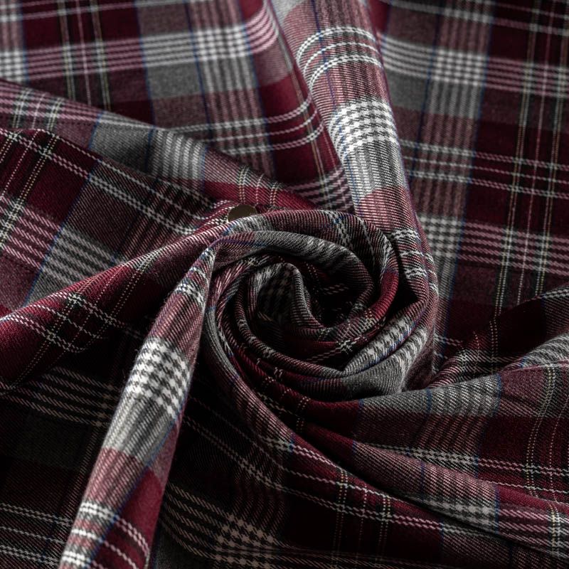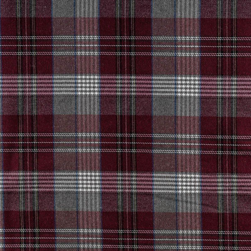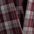 Ткань средней плотности, мягкая и приятная на ощупь, немного тянется, формоустойчива, хорошо драпируется и образует мягкие складки. Сочетание линий серого, синего и белого цветов на насыщенном винном фоне образует сложную красивую клетку тартан. Ткань отлично подойдет на костюмы, юбки, брюки, платья, жакеты.