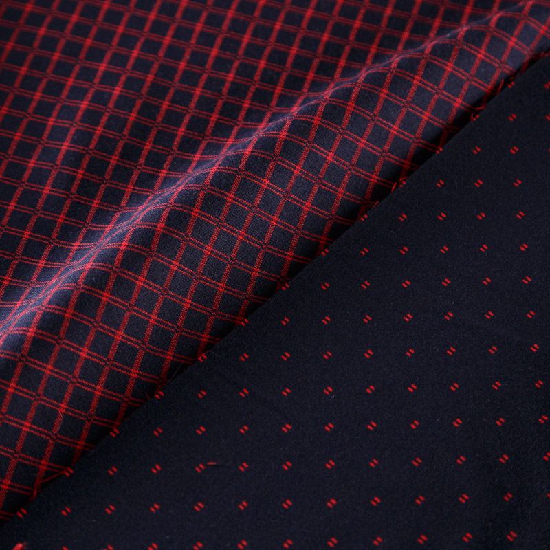 Оригинальная двухсторонняя ткань с принтом клетка с одной стороны и мелким геометрическим рисунком в виде вишневых точек - с другой. Материал плотный, но не толстый, хорошо драпируется, имеет мягкую поверхность с небольшими ворсинками. Прекрасно подходит для пошива платьев, сарафанов, юбок, брюк, жакетов.