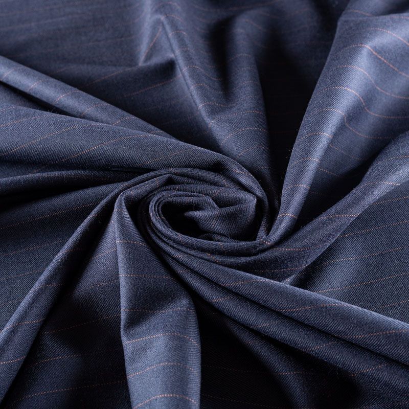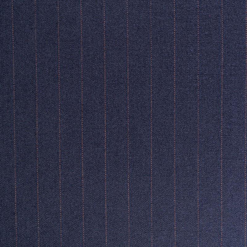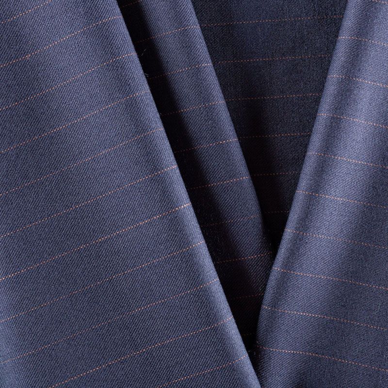 Ткань средней плотности, мягкая и приятная на ощупь, с диагональным плетением, немного тянется, формоустойчива, хорошо драпируется и образует мягкие складки. Тонкая полоска благородного оттенка кэмел на темно-синем фоне придает ткани элегантности и утонченности. Ткань отлично подойдет на костюмы, юбки, брюки, платья, жакеты.