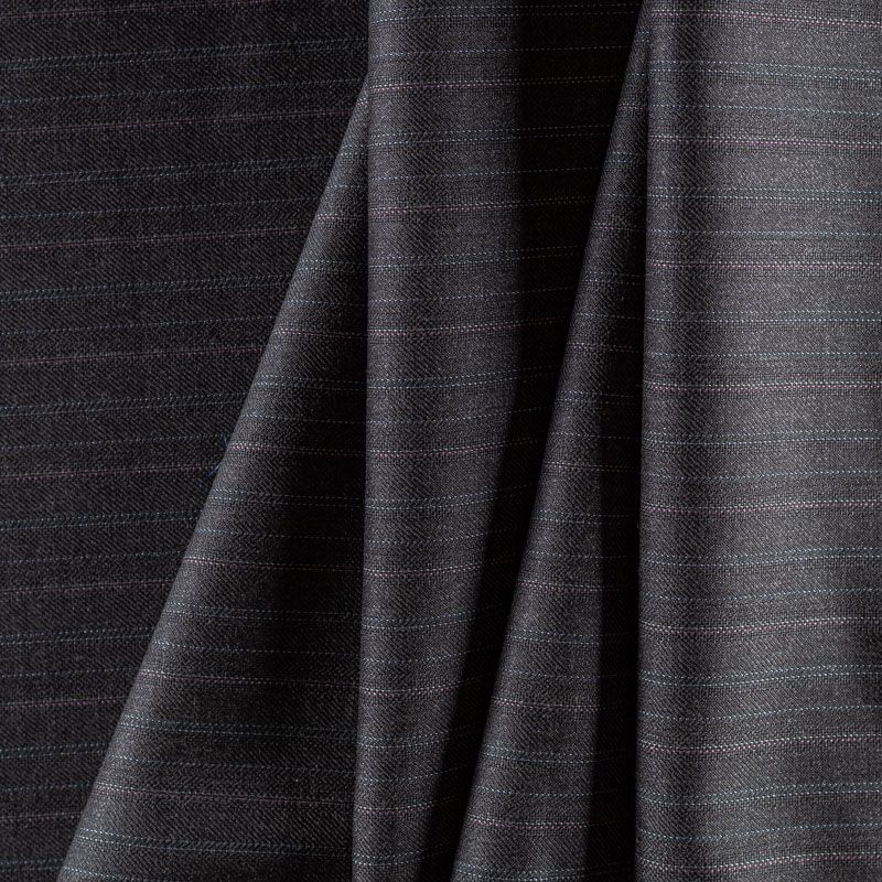 Костюмно-плательная ткань средней плотности, немного суховата, приятная на ощупь. На темно-сером фоне чередующиеся по цвету очень тонкие полоски, направление - вдоль кромки. Прекрасно подойдет для пошива брюк-палацио, жакета, платья по фигуре, сарафана, классического мужского или женского костюма.