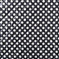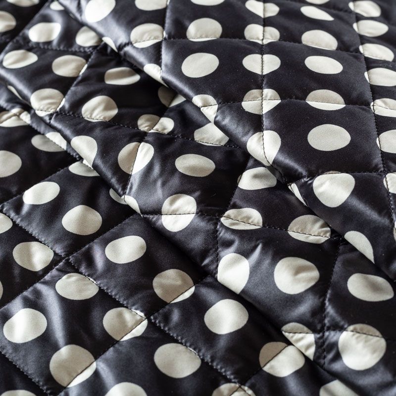 Трехслойная итальянская курточная ткань черного цвета в молочный горох, простеганная не крупными ромбами размером 3х3 см. Нижний слой черного цвета, заменяет подклад, средний слой - синтепон, верхний слой - матовый полиэстер, напоминающий болонь. Ткань легкая, пластичная, хорошо драпируется. Прекрасно подойдет для  пошива легких пальто, курток, бомберов, жилетов, накидок-кейпов, объемных сумок, одежды для домашних питомцев, туристического снаряжения.