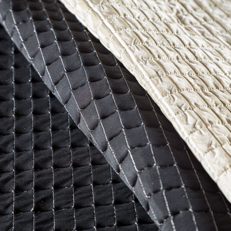 Оригинальная трехслойная итальянская курточная ткань бежевого оттенка с эффектом жатки, простеганная не крупными прямоугольниками. Нижний, черного цвета, заменяет подклад и верхний слой - полиэстер, по качеству напоминает болонь, а по фактуре кожу рептилии, между ними синтепон. Ткань легкая, пластичная, хорошо держит форму, отлично тянется по долевой, набирается на изделие объемом. Прекрасно подойдет для пошива легких пальто, курток, бомберов, жилетов, накидок-кейпов, объемных сумок, одежды для домашних питомцев, туристического снаряжения.