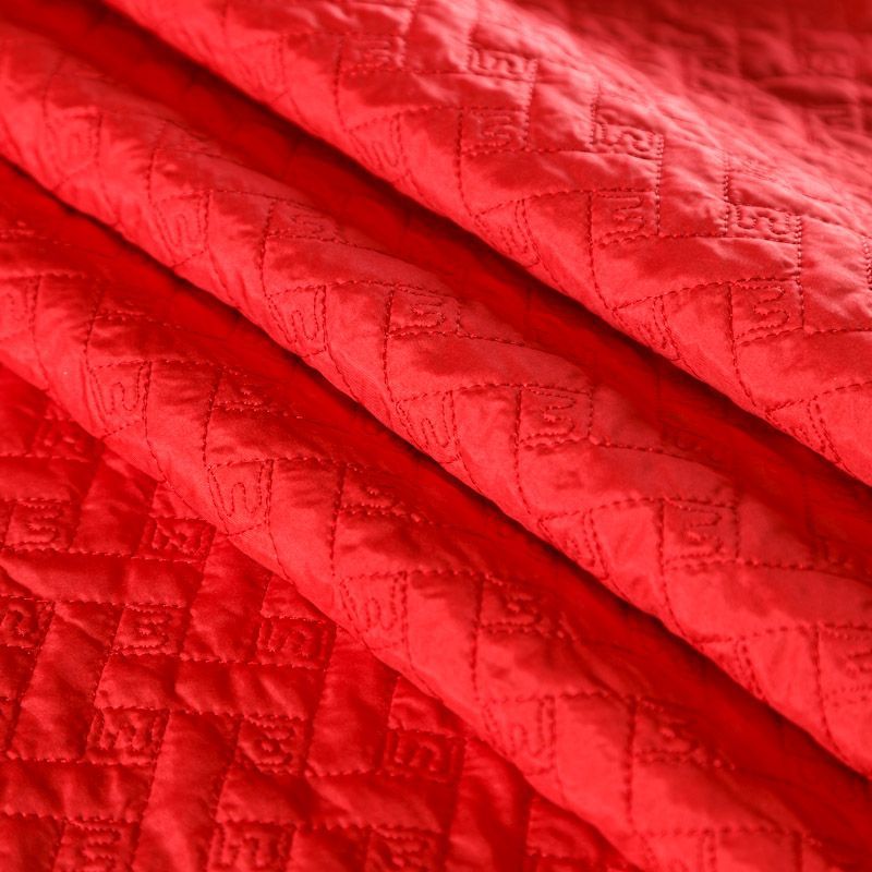 Двухслойная курточная ткань красного оттенка, с геометрической стежкой нитками в тон полотну. Нижний слой - синтепон, верхний -  полиэстер, по качеству напоминает болонь. Ткань легкая, пластичная, хорошо драпируется. Прекрасно подойдет для  пошива пальто, курток, жилетов, накидок-кейпов, объемных сумок, одежды для домашних питомцев, туристического снаряжения.