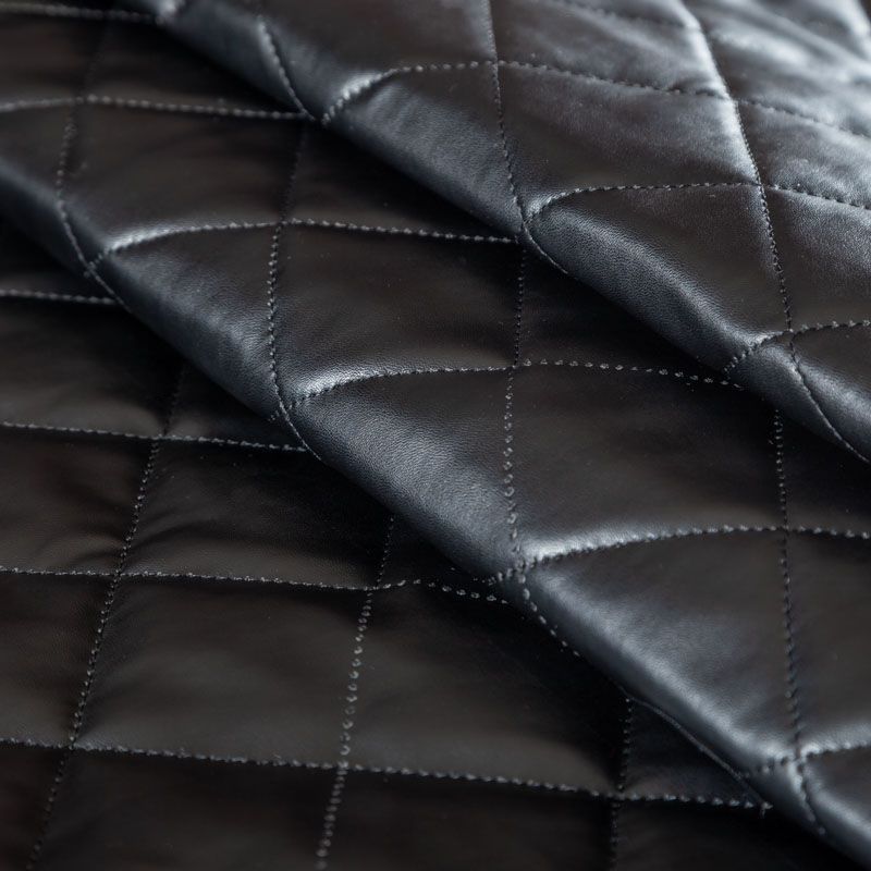 Двухслойная курточная стежка черного цвета, простеганная ромбами размером 5х5 см. Нижний слой - синтепон, верхний - мягкая матовая экокожа. Ткань легкая, пластичная, хорошо драпируется. Прекрасно подойдет для  пошива пальто, курток, жилетов, накидок-кейпов, объемных сумок, одежды для домашних питомцев, туристического снаряжения.