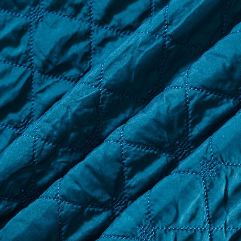 Двухслойная курточная ткань сине-зеленого оттенка, с геометрической стежкой нитками в тон полотну. Нижний слой - синтепон, верхний - полиэстер, по качеству напоминает болонь. Ткань легкая, пластичная, хорошо драпируется. Прекрасно подойдет для пошива пальто, курток, жилетов, накидок-кейпов, объемных сумок, одежды для домашних питомцев, туристического снаряжения.