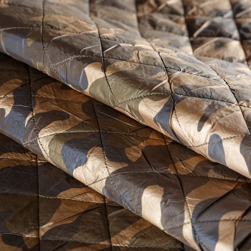 Двухслойная курточная ткань золотистого оттенка с оригинальным камуфлированным принтом, простеганная не крупными ромбами размером 4х4 см. Нижний слой - синтепон, верхний - полиэстер, по качеству напоминает болонь. Очень мягкая и легкая, пластичная, хорошо драпируется. Прекрасно подойдет для пошива легких пальто, курток, жилетов, накидок-кейпов, объемных сумок.