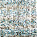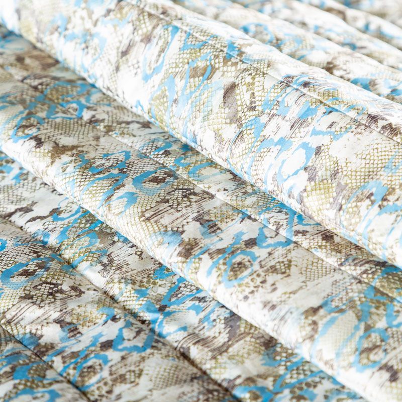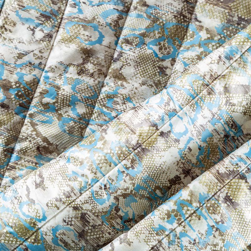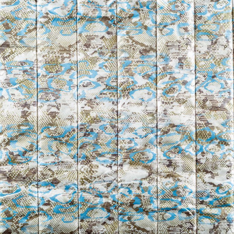 Трехслойная итальянская курточная ткань молочного цвета со стилизованным анималистическим принтом в зеленовато-голубых оттенках, простеганная вертикальными линиями. Нижний слой белого цвета, средний слой - синтепон, верхний слой - принтованная плащевая ткань. Ткань легкая, пластичная, хорошо драпируется. Прекрасно подойдет для  пошива пальто, курток, бомберов, жилетов, накидок-кейпов, комбинезонов, объемных сумок, одежды для домашних питомцев, туристического снаряжения.
