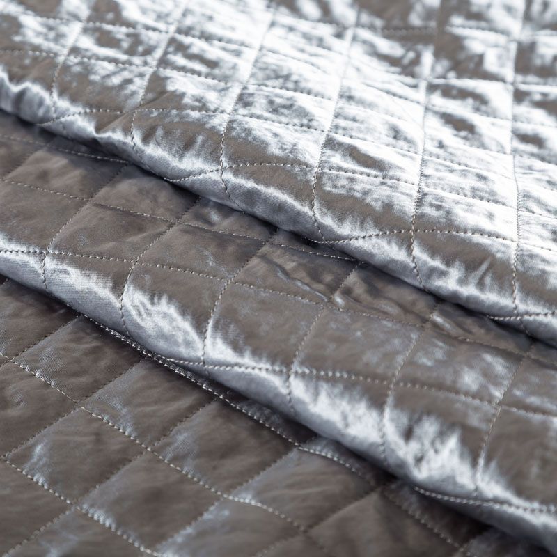 Двухслойная курточная ткань серебристо-серого оттенка с легким блеском, простеганная не крупными ромбами размером 3х3 см. Нижний слой - синтепон, верхний - полиэстер, по качеству напоминает болонь. Очень мягкая и легкая, пластичная, хорошо драпируется. Прекрасно подойдет для пошива легких пальто, курток, жилетов, накидок-кейпов, объемных сумок.