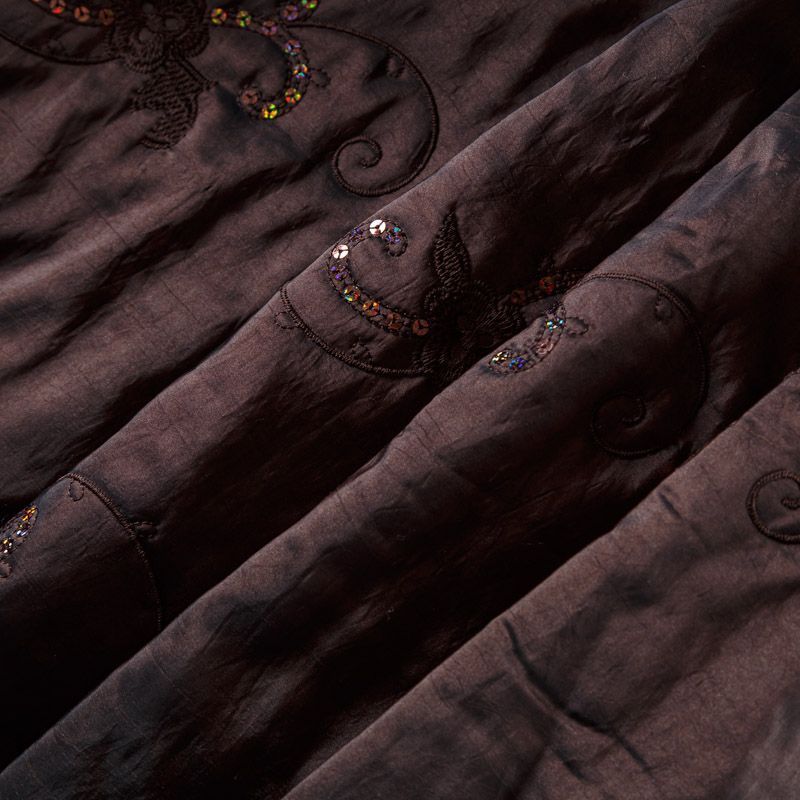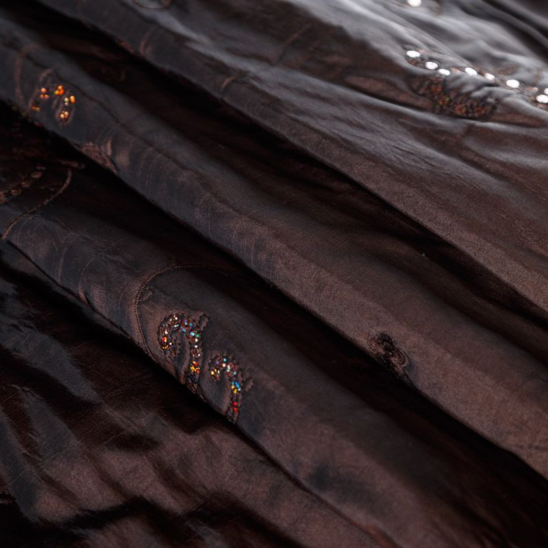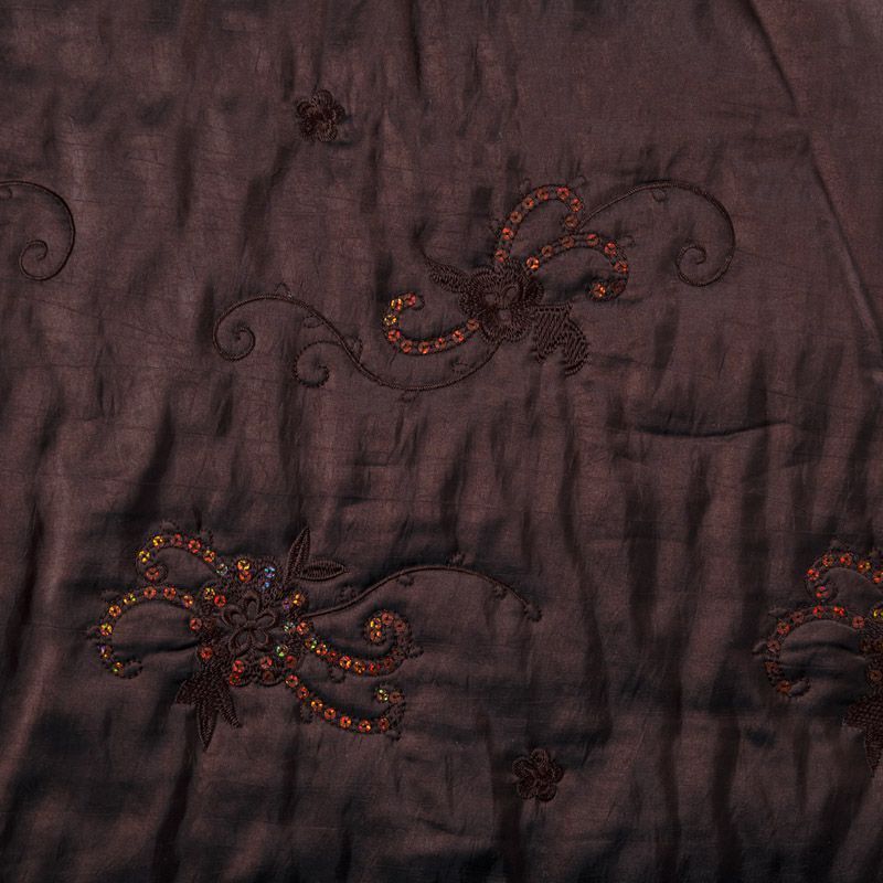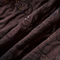 Двухслойная курточная ткань темно-коричневого цвета, с декоративной вышивкой, выполненной нитками в тон полотна и пайетками. Нижний слой - синтепон, верхний - полиэстер, по качеству напоминает болонь. Очень мягкая, пластичная, хорошо драпируется. Прекрасно подойдет для  пошива легких пальто, курток, жилетов, накидок-кейпов, объемных сумок.