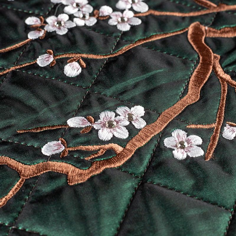 Курточный купон на синтепоне и подкладке, простеганный не крупными ромбами размером 3,5х3,5 см. С лицевой стороны тонкая, но прочная плащевая ткань с вышивкой в виде цветущей ветки сакуры, с изнаночной - желто-бежевая ткань с полоску. Материал мягкий, объемный и "воздушный", хорошо держит форму и подойдет для пошива легких пальто, курток, жилетов, накидок-кейпов, парки.