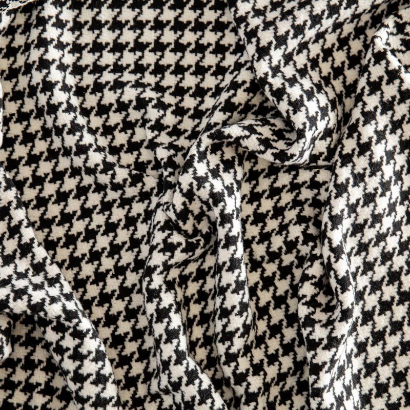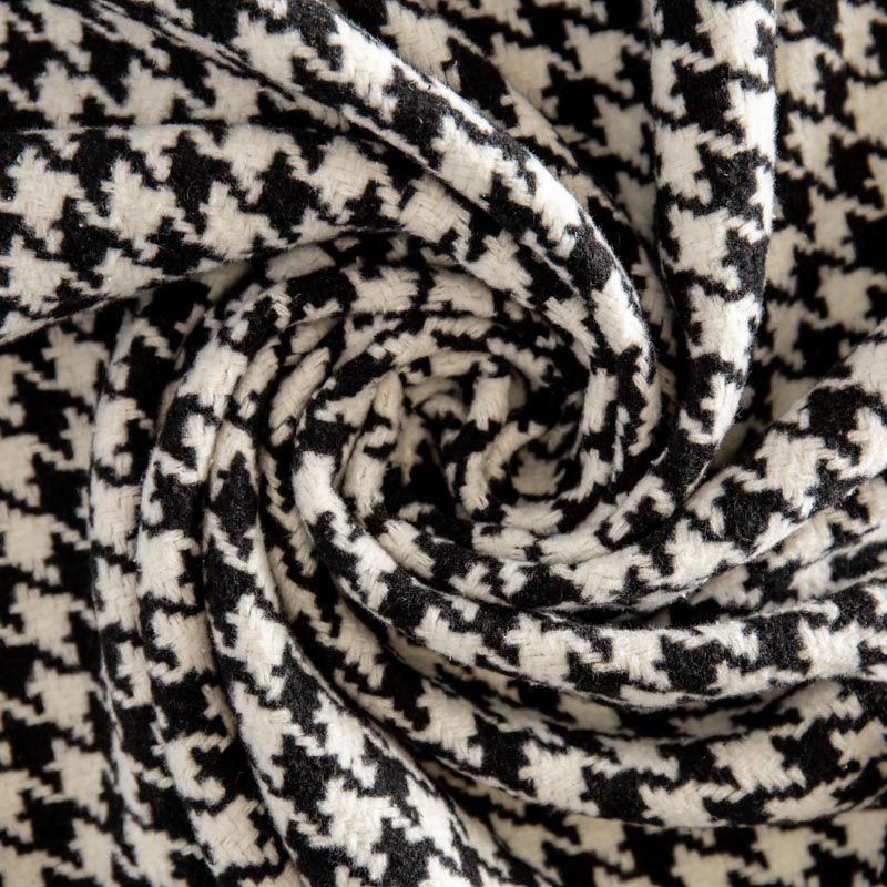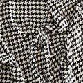Плотная пальтовая ткань с добавлением вискозы белого оттенка в черную куриную лапку, мягкая и приятная на ощупь, имеет короткий ворс, формоустойчива, хорошо драпируется. Ткань отлично подойдет для пошива пальто, теплых костюмов, юбки, шорт, жакета, кейпа, жилета.