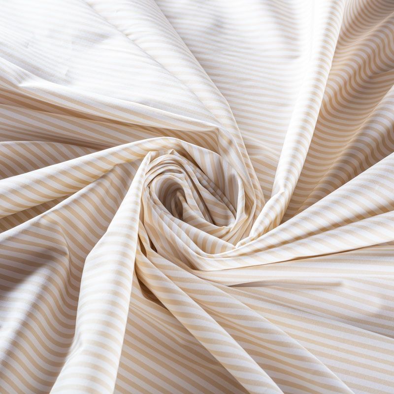 Итальянский плательно-рубашечный хлопок в узкую полоску бежево-оливкового оттенка. Ткань мягкая, лёгкая, непрозрачная, пластичная и приятная к телу, хорошо драпируется, имеет гладкую матовую поверхность и сатиновое плетение. Прекрасно подойдет как для пошива платья-рубашки, сарафана, платьев различных фасонов, туники, топа, летнего костюма, комбинезона.