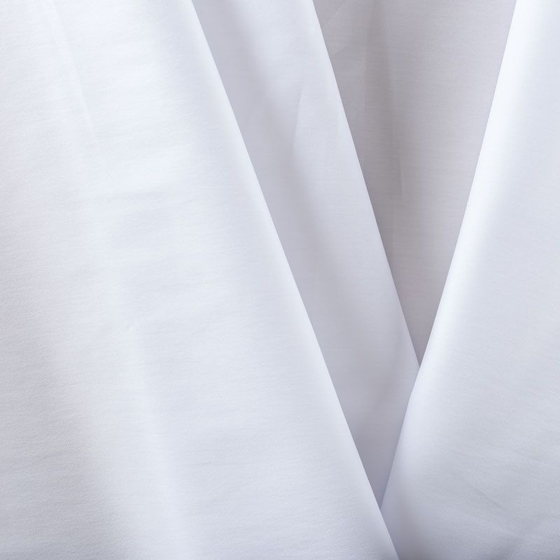 Плательно-рубашечная смемовая ткань белого цвета. Ткань мягкая, лёгкая, непрозрачная, пластичная и приятная к телу, хорошо драпируется, тянется за счет эластана в составе, имеет гладкую матовую поверхность и сатиновое плетение. Прекрасно подойдет как для пошива платья-рубашки, сарафана, платьев различных фасонов, туники, топа, рубашки, блузы, летнего костюма, комбинезона.