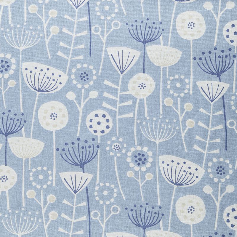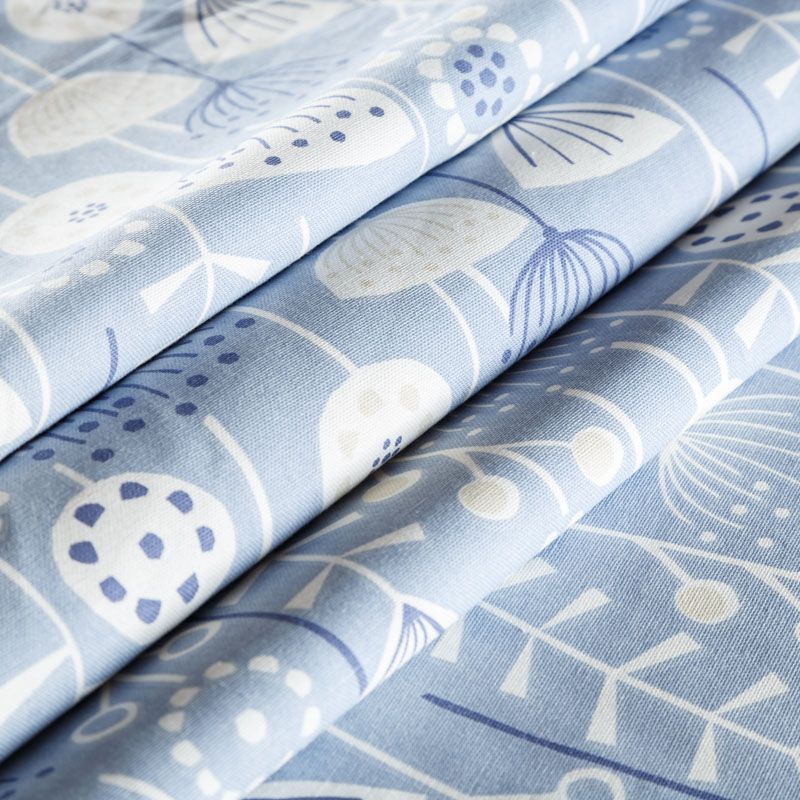 Хлопковая портьерная ткань Берген из коллекции Сканди английского производителя Fryett's Fabric. На голубой текстурированной основе наснесен принт в виде стилизованных растений и цветов в монохромной гамме. Ткань средней плотности, прекрасно держит форму, драпируется в устойчивые складки. Подойдет для классических портьер, римских штор, покрывал, подушек, скатертей, салфеток и других элементов текстильного интерьера как в самостоятельном исполнении, так и качестве компаньона к однотонным варинтам.