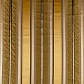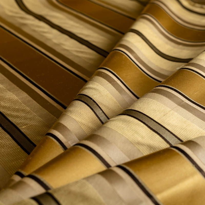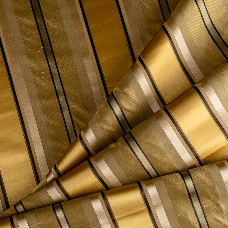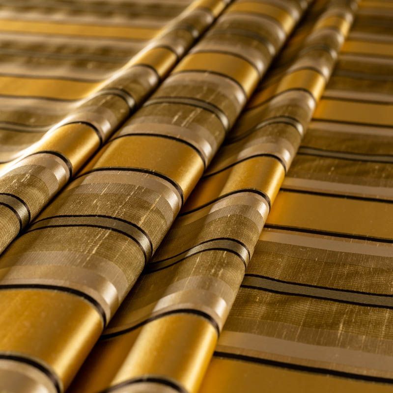 По своей структуре шелковые портьерные ткани являются мягким и красивым материалом, способным отражать свет. Изделия из шелка удивительно переливаются и блестят, придавая интерьеру помещения особую атмосферу и вид. Такие портьерные ткани лучше всего применять для создания покрывал, наволочек, штор, легких, воздушных и светлых – они отлично подойдут для затемненных мест либо закрытых окон. Ткань имеет вертикальные полосы в разных оттенках золотистого цвета, а так же сочетает в себе чередование полос матовой и блестящей текстур.