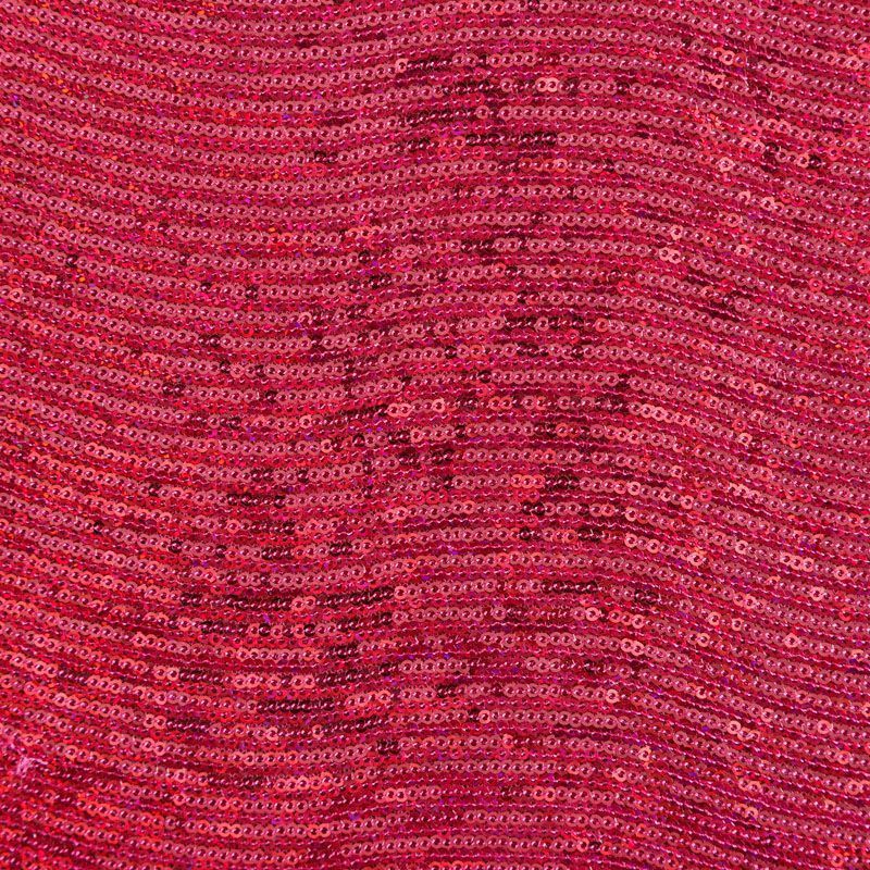 Эластичная сетка малинового оттенка по всей поверхности которой расположены глянцевые пайетки. Ткань очень хорошо драпируется, красиво переливается, имеет глянцевый блеск, пластичная, полоски расположены вдоль кромок, которые обработаны вышитым фигурным фестоном, набирается объемом,  Пайетки — идеальный материал для праздников и вечеринок. Из них получится эффектное платье, жакет, боди, туника, юбка или комбинезон.