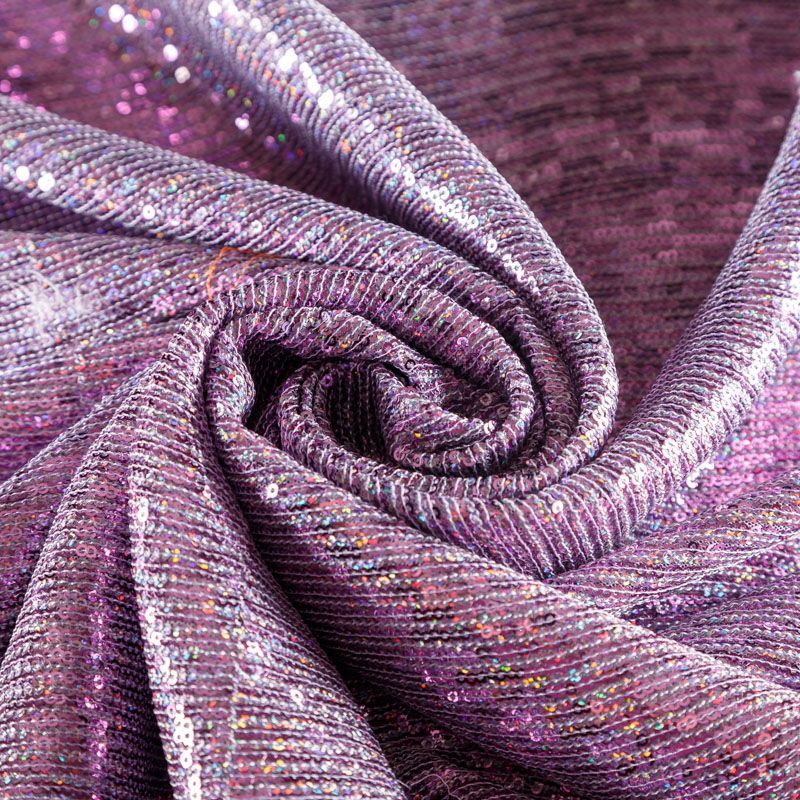 Эластичная сетка сиреневого оттенка по всей поверхности которой расположены глянцевые пайетки. Ткань очень хорошо драпируется, красиво переливается, имеет глянцевый блеск, пластичная, полоски расположены вдоль кромок, которые обработаны вышитым фигурным фестоном, набирается объемом, Пайетки — идеальный материал для праздников и вечеринок. Из них получится эффектное платье, жакет, боди, туника, юбка или комбинезон.