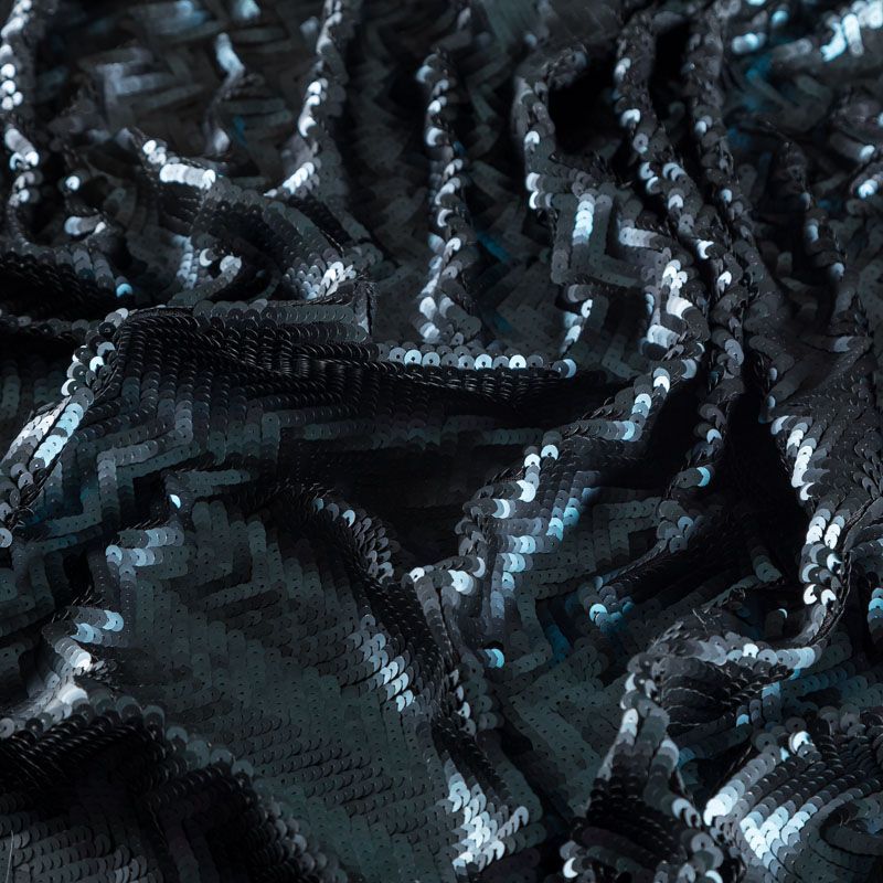Двухсторонние пайетки на трикотажной сетчатой основе иссиня-черного оттенка образуют узор в виде полоски и елочки. Пайетки среднего размера, с умеренным блеском. Полотно мягкое и пластичное, хорошо тянется, благодаря этому изделия получаются удобными и великолепно садятся по фигуре. Отлично подойдет для пошива  вечерних нарядов, костюмов для концертных выступлений, а также для танцев и гимнастики.
