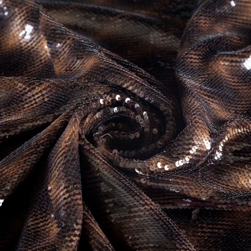 Мелкие глянцевые пайетки на плотной трикотажной основе образуют геометрический двухцветный орнамент. Ткань не просвечивается, пластичная, хорошо драпируется. Идеальный вариант для праздничных и вечерних образов: платья, костюма, юбки, широких брюк, топа, туники, а также для одежды в стиле спорт-шик.
