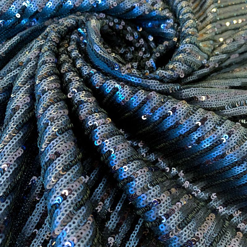 Пайетки на плотной сетчатой основе в тонкую чередующуюся полоску глянцевых и матовых блесток. Полоска расположена поперек полотна. Ткань хорошо драпируется, красиво переливается, имеет глянцевый блеск. Немного тянется, благодаря чему изделия получаются комфортными и отлично сидят по фигуре. Пайетки — идеальный материал для праздников и вечеринок. Из них получится эффектное платье, туника, юбка или комбинезон.