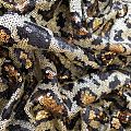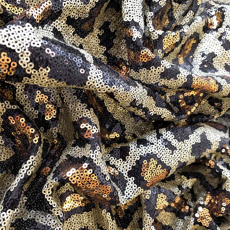 Пайетки в виде золотой шкуры леопарда с блестками. Вышиты на черной эластичной сетке. Роскошно смотрится в блестящих нарядных комбинезонах, сверкающих платьях и искрящихся блузках, юбках, туниках, концертных костюмах, нарядах для танцев. На ощупь полотно не тяжелое, достаточно пластичное и удобное в носке.