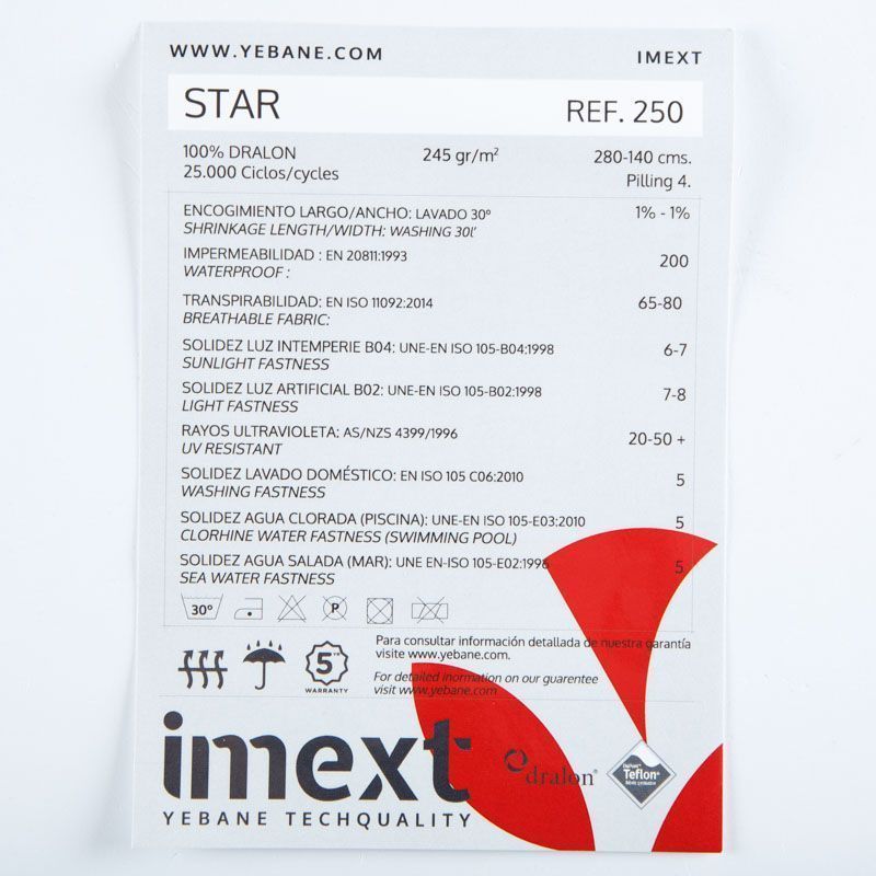 Прочная, надежная, износоустойчивая акриловая ткань Dralon от испанского производителя Yebane из коллекции Imext (Outdoor) предназначена для применения в экстремальных погодных условиях. Материал подходит для оформления уличных беседок, летних площадок кафе, разноплановых тентов. Также ткань широко применима в пошиве мягких элементов для садовой мебели. Ткани для улицы дополнительно обработаны пропиткой Teflon, что придает им водо-, грязе- отталкивающие свойства. Материал легко очищается от грязи, быстро сохнет после намокания, не задерживает излишки влаги, хорошо вентилируется, не накапливая посторонние запахи.
